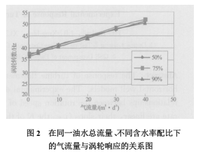 圖1中分別給出了不同氣流量、油水兩相含水率分別為50%和90%下的油水總流量與渦輪響應(yīng)的關(guān)系。