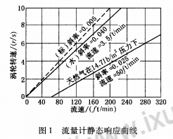 圖1是哈里伯頓公司高靈敏度流量計靜態(tài)響應曲線。從圖1可以看出,該儀器在水中的啟動速度為3.5ft/min,在氣中的啟動速度為50ft/min。哈里伯頓公司高靈敏度流量計在水中的測量精度為lft/min,由此得出該儀器在水中測量精度與啟動速度的關系為1:3.5。據(jù)此估算,該儀器在氣中的測量精度約為50/3.5=14ft/min。進而得到,此儀器在水中的測量精度與氣中測量精度的比值約為1:14。