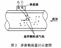 多普勒法是利用聲學多普勒原理確定流體速度。多普勒原理是若聲源和目標之間有相對運動,會引起聲波在頻率上的變化,頻率變化正比于運動的目標和靜止的換能器之間的相對速度。圖2是超聲多普勒流量計示意圖。發(fā)射晶體T1發(fā)射的超聲波遇到流體中運動的顆?;驓馀莘瓷浠貋碛山邮站wR1接收,發(fā)射信號與接收信號的多普勒頻率偏移與流體速度成正比。忽略管壁影響,假設流體沒有速度梯度且粒子是均勻分布的,可得:
