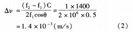 假設發(fā)射晶體T1的發(fā)射頻率f1為1MHz,θ角為6O°,頻率差f1一f2的測量精度為1Hz,聲波在水中的傳播速度為1400m/s,則多普勒法在水中的速度測量精度為: