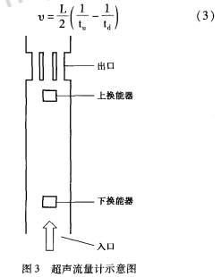 如圖3所示。設兩個換能器之間的距離為L,聲波的傳播速度為C,流體的速度為v,如果儀器靜止,則聲波向上傳播的時間為