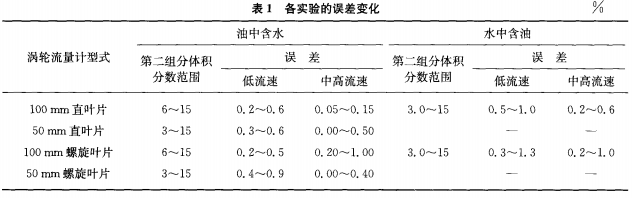 油水混合液在水平管道內(nèi)靜止時油和水是分層的;在開始流動或很低流速時處于油水兩層的分層流;隨著流速增加油水逐漸混合,流速愈大兩相混合愈均勻;當(dāng)進(jìn)入渦輪葉片轉(zhuǎn)動時兩相混合將更為均勻。因此,混合液兩相均勻程度是影響測量誤差的因素之一。
