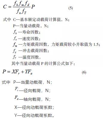 將選型軸承的參數(shù)代入(5)、(6)中直接得出基本額定動(dòng)載荷C,而選型軸承的動(dòng)載荷Cr 必須大于基本額定動(dòng)載荷C 才能滿足設(shè)計(jì)要求。