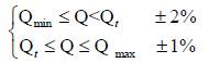 由圖2 可見(jiàn),儀表系數(shù)可分為二段,即線性段和非線性段。在非線性段, 實(shí)際特性受軸承摩擦力、流體粘性阻力影響較大。當(dāng)流量低于Qmin 時(shí),儀表系數(shù)隨著流量迅速變化。壓力損失與流量的平方成正比關(guān)系。通常線性段約為工作段的2/3,其特性與渦輪結(jié)構(gòu)參數(shù)及流體粘性有關(guān)。隨流量的變化其儀表系數(shù)K 也會(huì)有一定的變化,但變化不大,通常將其變化幅度稱為流量計(jì)的計(jì)量準(zhǔn)確度。對(duì)于產(chǎn)品設(shè)計(jì)而言,期望能將線性段的流量范圍拓展,一臺(tái)流量計(jì)能覆蓋同口徑的不同流量范圍,使得產(chǎn)品量程比變寬從而降低生產(chǎn)管理與生產(chǎn)批量加工成本。對(duì)于1.0 級(jí)的高壓柴油流量計(jì)量表,以Qt(0.2Qmax)為分界流量點(diǎn),將計(jì)量線性分為兩段,其中一段的*大允許誤差為±2%,而另一段的*大允許誤差為±1% 。按圖2 所示,通常每臺(tái)渦輪流量計(jì)均有較為相似特性曲線,若將可測(cè)量流量范圍做寬,就能在同口徑不同流量范圍進(jìn)行分段截取,以實(shí)現(xiàn)一臺(tái)流量計(jì)能覆蓋同口徑的不同流量范圍。