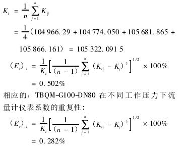 計(jì)算得出TBQM-G65-DN50在不同工作壓力下流量計(jì)儀表系數(shù)的重復(fù)性: