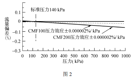 從圖2 中, 我們可以看出壓力對測量準確度的影響:當工藝壓力增大, 會使流量計產生一個負向偏差, 表現(xiàn)為流量顯示值比實際值偏小;當壓力減小時, 會使流量計產生一個正向偏差, 表現(xiàn)為流量顯示值比實際值偏大。