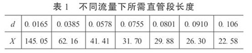 3.直管段長(zhǎng)度和軟化水計(jì)量表精度的初步預(yù)測(cè)在工程設(shè)計(jì)中,根據(jù)流體性質(zhì)、流量和雷諾數(shù)確定α和d值。這樣,按照式(5)就可以依不同的流量計(jì)精度要求,對(duì)直管段長(zhǎng)度進(jìn)行初步預(yù)測(cè),或確定直管段長(zhǎng)度后,對(duì)流量計(jì)的精度做初步預(yù)測(cè)。當(dāng)δ= 0.2%時(shí),不同流量下所需直管段長(zhǎng)度見表1。