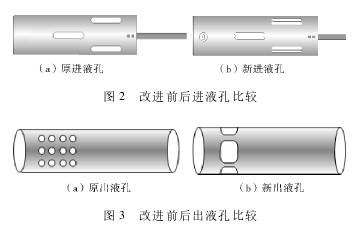防砂卡防爆渦輪流量計結(jié)構(gòu)如圖1所示,主要由防爆渦輪流量計、篩狀出液孔、防爆渦輪流量計安裝短接、解卡管、解卡管開槽、中心管、長條孔(銷釘運動槽7)、薄壁筒、進(jìn)液孔、解卡管固定銷釘、含水傳感器安裝筒組成。采用等效面法,將進(jìn)液孔一分為二,改為寬2mm的矩形進(jìn)液孔,解決從進(jìn)液孔進(jìn)入的長垢片或大垢片造成的砂卡,如圖2所示。將原先3個方型的出液孔改為直徑4mm的陣列狀的篩孔,解決儀器在下井過程中從出液孔進(jìn)入儀器的長垢片、大垢片造成的砂卡,如圖3所示。