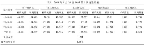 表1為2014年8月24日P033*6次校準(zhǔn)結(jié)果。本次校準(zhǔn)平均K值1.301r/(m3?s),大于1.0r/(m3?s),同時*大引用誤差為1.08%,小于*大允許誤差3%,啟動排量2m2/d時的平均轉(zhuǎn)速1.850r/s,因此P033校準(zhǔn)合格。同樣,P032、K001、K018先后校準(zhǔn)合格。因此,在啟動排量、*大允許誤差合格的前提下,K值大于等于1,K值可以評價解卡管、進(jìn)液孔、出液孔造成的局部阻力損失。