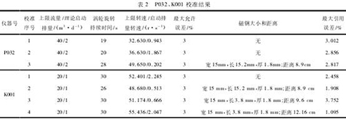 由表2可知,解卡裝置末端粘貼寬15mm、長15.2mm、厚1.8mm的弧形磁鋼,安裝距離防爆渦輪流量計磁鋼8.9cm時,P032*3次渦輪葉片轉(zhuǎn)動持續(xù)時間28s,40m3/d平均轉(zhuǎn)速49.650r/s;同樣的磁鋼大小和安裝距離,K001*2次調(diào)試渦輪,葉輪轉(zhuǎn)動持續(xù)時間26s,*大引用誤差1.908%合格,啟動排量1m3/d時,平均轉(zhuǎn)速0.513r/s,不合格。K001*3次,解卡裝置末端粘貼寬15mm、長3.8mm、厚1.8mm的弧形磁鋼,安裝距離防爆渦輪流量計磁鋼9.6cm,渦輪沒有調(diào)試持續(xù)時間30s,但校準(zhǔn)結(jié)果*大引用誤差3.752%不合格,啟動排量1m3/d沒有啟動,平均轉(zhuǎn)速0.666r/s不合格。K001*4次,重新調(diào)試渦輪,持續(xù)時間30s,同時將寬15mm、長3.8mm、厚1.8mm的弧形磁鋼,距離防爆渦輪流量計磁鋼的距離調(diào)整為12.16cm,*大引用誤差1.095%,啟動排量1m3/d啟動,平均轉(zhuǎn)速2.587。故*終確定弧形磁鋼寬15mm、長3.8mm、厚1.8mm,距離防爆渦輪流量計磁鋼的距離為12.16cm。此時在流量計啟動排量時,渦輪葉片轉(zhuǎn)動。