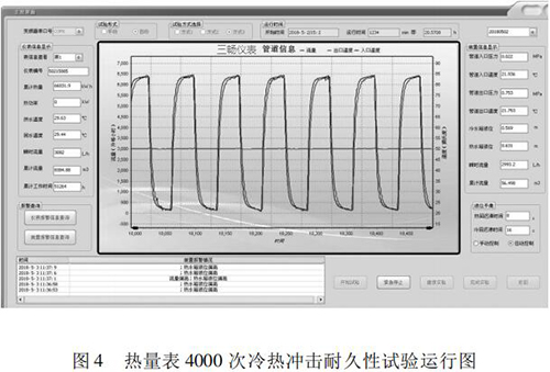 本文研究的 4000 次冷熱沖擊試驗的實現(xiàn)具有以下特點: (1)基于“工控機(jī) +水泵 + 消防水流量計”的閉環(huán)控制系統(tǒng),實現(xiàn)了流量自動反饋調(diào)節(jié),滿足試驗要求; (2)通過四個開關(guān)閥的時序切換,自動控制試驗溫度,很好的完成了 4000 次溫度沖擊試驗; (3)通過“工控機(jī) + 數(shù)據(jù)數(shù)據(jù)采集卡”的數(shù)據(jù)采集系統(tǒng),實時監(jiān)控試驗過程中的流量、溫度、壓力等相關(guān)參數(shù),實現(xiàn)試驗方式的自動控制,并能對試驗數(shù)據(jù)進(jìn)行分析與評定。 (4)試驗的全過程為智能自動化,可無人員留守看護(hù)。試驗結(jié)果可直接反映出熱量表在長時間運(yùn)行后的可靠性。為我國熱量表耐久性試驗研究提供檢測手段,為促進(jìn)產(chǎn)品質(zhì)量提升做好技術(shù)保障。