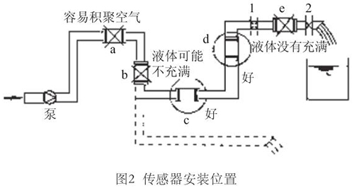 液體流動方向必須與傳感器殼體上箭頭方向一致。對于能正反向測量的冷凍水回水流量計,若方向不一致雖仍可測量,但設(shè)定的顯示流動正反方向不符,必須改正之。若拆傳感器工作量大,也可改變傳感器上箭頭方向和重新設(shè)定顯示儀表符號。管道未充滿液體主要是管網(wǎng)工程設(shè)計或傳感器安裝位置不妥,使傳感器測量管內(nèi)不能充滿液體。應(yīng)采取措施,避免安裝如圖2所示a,e位置和以虛線管排放時b位置,改裝到c,d位置。