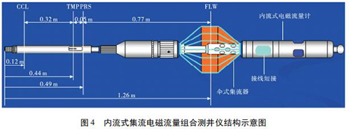 1. 2 內(nèi)流式集流甲醇計(jì)量表如圖 4 所示,內(nèi)流式集流電磁組合測(cè)井儀主要采用內(nèi)流式集流甲醇計(jì)量表,并組合了井溫壓力磁定位儀。利用電磁感應(yīng)原理測(cè)量平均流速,體積流量計(jì)算公為: