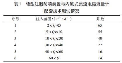 在實(shí)際應(yīng)用中,使用輕型注脂防噴裝置與內(nèi)流式集流甲醇計(jì)量表配套技術(shù)對(duì)喇叭口在射孔層上注聚井進(jìn)行測(cè)試。輕型注脂防噴裝置與內(nèi)流式集流甲醇計(jì)量表配套技術(shù)施工工藝參見文獻(xiàn),測(cè)試情況見表 1 所示,低注入量井( ≤10 m3 /d) 占到 56. 60% 。