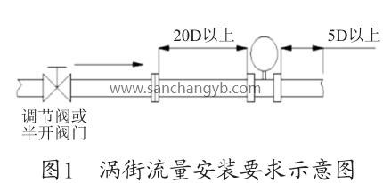 根據(jù)圖1渦街流量安裝要求示意圖及廠家的設(shè)備說(shuō)明書要求,流量計(jì)上游的直管段長(zhǎng)度至少為20D≈1 600mm,下游的直管段至少在5D≈400mm,D=80mm 為管道直徑。圖2為現(xiàn)場(chǎng)安裝圖,流量計(jì)上游僅為600mm <1 600mm,此流量計(jì)安裝位置有誤,對(duì)測(cè)量值有一定的影響,造成測(cè)量偏差,需調(diào)整流量計(jì)的安裝位置。