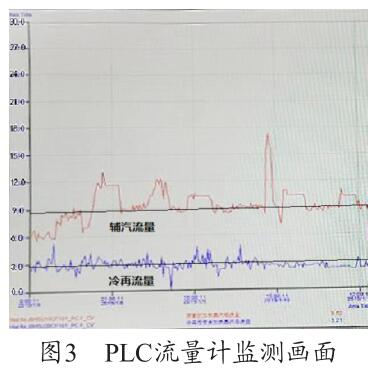通過(guò)圖3 PLC 流量計(jì)監(jiān)測(cè)畫面可以看出,PLC 上輔汽測(cè)量用的氣體渦輪流量表的量程設(shè)置為30t/h,現(xiàn)場(chǎng)設(shè)備量程實(shí)際為6t/h,兩者嚴(yán)重不符,因此測(cè)量值4t/h 為錯(cuò)誤值(單臺(tái)機(jī)組運(yùn)行),需要對(duì)程序進(jìn)行修改。
