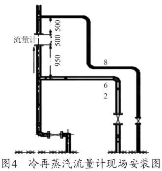 根據(jù)圖1渦街流量安裝要求示意圖及廠家的設(shè)備說(shuō)明書要求,流量計(jì)上游的直管段長(zhǎng)度至少為20D≈1 300mm,下游的直管段至少在5D≈325mm,D=65mm 為管道直徑。圖4為冷再蒸汽流量計(jì)現(xiàn)場(chǎng)安裝圖,流量計(jì)上游僅為950mm<1600mm,此流量計(jì)安裝位置有誤,對(duì)測(cè)量值有一定的影響,造成測(cè)量偏差,需調(diào)整流量計(jì)的安裝位置。