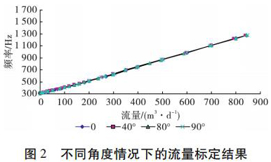 為了考察井眼斜度變化對(duì)測(cè)河水流量計(jì)測(cè)量流量的影響,開展了非集流測(cè)河水流量計(jì)在不同斜度情況下的流量測(cè)量模擬實(shí)驗(yàn)。模擬實(shí)驗(yàn)在大慶油田多相流實(shí)驗(yàn)室進(jìn)行,儀器外徑 38 mm,模擬井筒內(nèi)徑為 124 mm,實(shí)驗(yàn)介質(zhì)是水,傾斜角度分別為 0°、40°、80°和 90°( 水平) ,流量范圍為 5 ~ 850 m3 /d。實(shí)驗(yàn)結(jié)果表明,在儀器居中條件下,井眼斜度變化對(duì)測(cè)河水流量計(jì)的儀表常數(shù)沒有影響,滿量程誤差不大于 4% ,因此可以應(yīng)用測(cè)河水流量計(jì)進(jìn)行水平井注水剖面測(cè)量。不同角度情況下的實(shí)驗(yàn)結(jié)果如圖 2 所示。