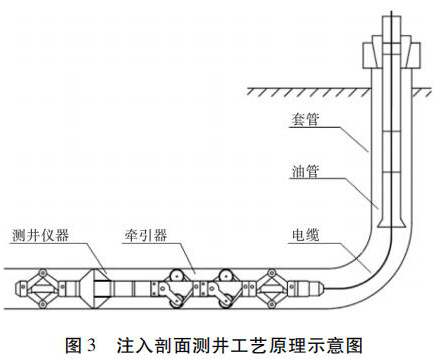 水平井注水井注入剖面測(cè)井工藝原理如圖 3 所示。在垂直井段,儀器在重力作用下可以通過注入管柱下入到井內(nèi),注入管柱下端須裝有喇叭口,且喇叭口應(yīng)在造斜點(diǎn)以上,保證測(cè)井完成后儀器順利起出,不發(fā)生卡儀器問題。儀器通過喇叭口以后在重力作用下繼續(xù)向下移動(dòng),當(dāng)儀器不能靠重力下移時(shí),啟動(dòng)牽引器,利用牽引器將儀器推送到井底,上提電纜過程中進(jìn)行測(cè)井。