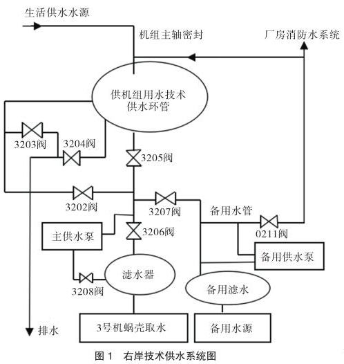 大化電廠技術(shù)供水包括右岸和左岸供水,本文以右岸 3 號(hào)機(jī)技術(shù)供水系統(tǒng)增設(shè)帶現(xiàn)場(chǎng)顯示燃油流量表技術(shù)改造方案為例進(jìn)行分析說(shuō)明。右岸技術(shù)供水系統(tǒng)(見(jiàn)圖 1)由各機(jī)組單元蝸殼取水主水源、濾水器、主供水泵、正反向切換閥(3202 閥與 3204 閥開(kāi)為反向取水,3203 閥與 3205閥開(kāi)為正向取水,運(yùn)行時(shí)只開(kāi)其中一種)、備用水源、備用濾水器、備用供水泵和備用總水管構(gòu)成一個(gè)整體,并通過(guò) 0211 閥與廠房消防水系統(tǒng)相連接,可通過(guò)主水源自流供水、主水源水泵增壓供水、備用水源自流供水、備用水源水泵增壓供水等不同供水方式向機(jī)組推力軸承冷卻器和發(fā)導(dǎo)軸承冷卻器、水導(dǎo)軸承冷卻器、發(fā)電機(jī)空氣冷卻器提供冷卻水源。機(jī)組技術(shù)供水正常運(yùn)行采用單元蝸殼取水的供水方式運(yùn)行,以備用水源供水為輔。機(jī)組主軸密封用水分別取自生活供水水源和技術(shù)供水備用總管水源,向機(jī)組大軸提供可調(diào)水壓端面密封水源。在現(xiàn)場(chǎng)配置一個(gè)技術(shù)供水現(xiàn)地單元柜,實(shí)現(xiàn)對(duì)機(jī)組技術(shù)供水系統(tǒng)設(shè)備自動(dòng)控制、故障保護(hù)及報(bào)警。柜內(nèi)配置可編程 PLC 控制系統(tǒng),電控柜對(duì)主供增壓泵、3202 至 3208 電動(dòng)碟閥進(jìn)行流程控制。