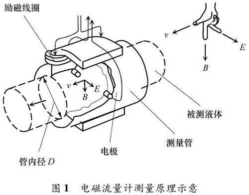 焦油流量計的測量原理如圖 1 所示。根據(jù)法拉*電磁感應(yīng)定律,導(dǎo)電液體在磁場中流動會產(chǎn)生電動勢 E,它與磁感應(yīng)強(qiáng)度 B、導(dǎo)電液體平均流速 v 成一定比例關(guān)系: