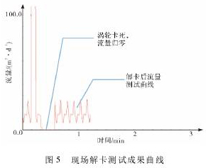防砂卡重油流量計量表在五大隊成功解卡370井次,現(xiàn)場解卡測試曲線見圖5。剛測試時,渦輪葉片轉(zhuǎn)動正常,大約在20s左右,由于流體帶進(jìn)的雜質(zhì)導(dǎo)致流量曲線歸零。通過儀器二芯供電收傘,大約15s后再開傘,一芯流量供電測試,渦輪葉片通過瞬間開收傘,擴(kuò)大了葉輪與渦輪殼體之間的空間,雜質(zhì)通過渦輪葉片旋轉(zhuǎn)正常。從曲線可以看出,在解卡前和解卡后,渦輪旋轉(zhuǎn)--致,都為15m3/d左右,而且解卡前后沖次一致,重油流量計量表解卡裝置有效解決了因油井出砂、垢片、間隙小造成的砂卡,砂卡率由原先的70%降低到30%,實(shí)現(xiàn)了產(chǎn)液剖面流量準(zhǔn)確測試。