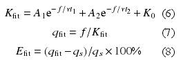 利用雙指數衰減函數對儀表系數與雷諾數關系進行擬合,在層流范圍內(Re<2300),儀表系數隨Re增加迅速增加,尤其是在Re<1000范圍內更加明顯;而在Re>3000紊流范圍內,儀表系數變化平緩,接近常數;在1000