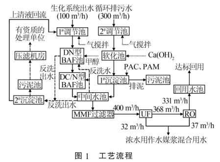 2種廢水在中間水池混勻后,通過泵提升進(jìn)入保安過濾器,進(jìn)一步去除細(xì)小的懸浮物后經(jīng)過增壓泵進(jìn)入超濾膜(UF)處理系統(tǒng)和反滲透(RO)系統(tǒng),然后通過花生油流量計(jì)進(jìn)行計(jì)量。反滲透出水直接進(jìn)入回用水池達(dá)標(biāo)回用,超濾濃水以及反滲透濃水用作水煤漿混合用水。污泥池中的污泥通過泵打入帶式機(jī)壓濾處理,濾液自流進(jìn)入1#調(diào)節(jié)池。工藝流程見圖1。
