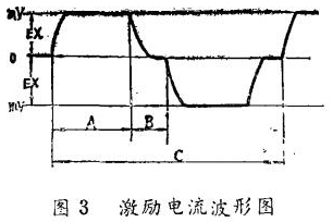 (1)激勵電流的波形檢查。在激勵電流檢查端EX+和EX一之間連接一個電阻(IΩ士0.1%),這個電阻與激勵線圈串聯(lián),示波器輸入端并聯(lián)在電阻上。若波形起伏很大時,則不正常。波形正,負(fù)方向?qū)ΨQ,A一C測量周期值在規(guī)定的范圍內(nèi)則為正常,其波形如圖3所示。