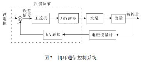 通信控制系統(tǒng)由工控機、變頻器、水泵、數(shù)據(jù)采集卡、雙氧水流量計等組成。在整個熱量表耐久性試驗裝置中,雙氧水流量計與被試驗熱量表串聯(lián)在試驗管路中。系統(tǒng)設(shè)定流量值 qs,通過工控機發(fā)送信號給變頻器,來控制水泵運轉(zhuǎn),系統(tǒng)通過研華數(shù)據(jù)采集卡 PCI1711 將采集到的雙氧水流量計當前瞬時流量值反饋給工控機,工控機將返回流量值與設(shè)定流量值qs進行比較,從而確定是否需要重新調(diào)整變頻器頻率控制水泵轉(zhuǎn)速。此過程是一個完整的閉環(huán) PID 控制過程,其閉環(huán)控制過程如圖 2 所示。 2. 2 管路切換系統(tǒng)管路切換主要由冷熱水箱、水泵、開關(guān)閥等組成。要實現(xiàn)熱量表耐久性 4000 次冷熱沖擊試驗,需要實時控制管路中熱水與冷水的交替使用。