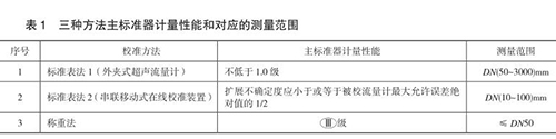 本規(guī)范包含三種校準(zhǔn)方法,分別為標(biāo)準(zhǔn)表法 1(外夾式超聲流量計(jì))、標(biāo)準(zhǔn)表法 2(串聯(lián)移動(dòng)式在線校準(zhǔn)裝置)和稱重法,編制組對(duì)每種方法進(jìn)行了大量的實(shí)驗(yàn),并積*與熱水流量計(jì)生產(chǎn)廠家及用戶溝通探討,積累了豐富的經(jīng)驗(yàn),獲得了大量的實(shí)驗(yàn)數(shù)據(jù),*終確定三種方法的主標(biāo)準(zhǔn)器計(jì)量性能和對(duì)應(yīng)的測(cè)量范圍,如表 1 所示。