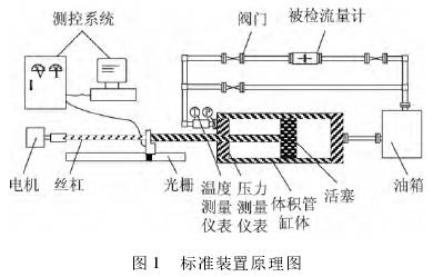 燃油動態(tài)流量標(biāo)準(zhǔn)裝置的工作原理為:工作過程中電機旋轉(zhuǎn),驅(qū)動滾珠絲杠帶動標(biāo)準(zhǔn)體積管活塞左行,排出液體流經(jīng)控制閥門及被檢流量計后,經(jīng)過過濾器回到儲油箱;同時,儲油箱里的油經(jīng)過下游管段進入標(biāo)準(zhǔn)體積管。