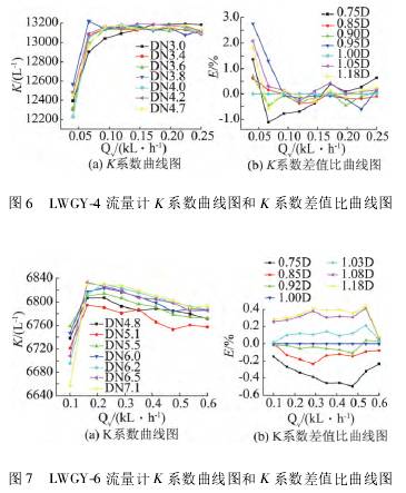 圖3~圖8分別為流量計的K系數(shù)曲線圖和無量綱化后的差值比曲線圖。