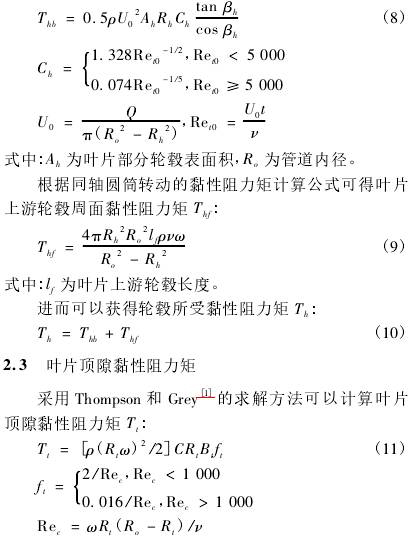式中:Td為葉片驅(qū)動(dòng)力矩;Th為輪轂周邊黏性阻力矩;Tt為葉片頂隙黏性阻力矩;Tw為輪轂端面黏性阻力矩;Tb為軸承黏性阻力矩;Tm為軸與軸尖機(jī)械阻力矩