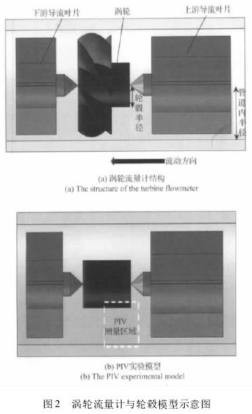 實(shí)驗(yàn)在中國(guó)科大水平循環(huán)水實(shí)驗(yàn)平臺(tái)上進(jìn)行,實(shí)驗(yàn)采用20mm口徑的柴油計(jì)量表,量程范圍是1~80方/天,其中較好線性段范圍是5~50方/天,流量計(jì)渦輪為等重疊度渦輪(不同半徑位置葉柵重疊度相同),具體參數(shù)如表1所示,這種流量計(jì)在大慶油田的生產(chǎn)測(cè)井中廣泛應(yīng)用,其結(jié)構(gòu)如圖2(a)所示。來(lái)流經(jīng)過(guò)一段導(dǎo)流葉片整流后進(jìn)入渦輪的環(huán)空空間,驅(qū)動(dòng)葉輪轉(zhuǎn)動(dòng),輸出響應(yīng)信號(hào)。在柴油計(jì)量表的線性響應(yīng)區(qū)間中,處于穩(wěn)定轉(zhuǎn)動(dòng)時(shí)渦輪葉片對(duì)流體的干擾較少,相對(duì)來(lái)流攻角較小,對(duì)流體的軸向速度分布基本沒(méi)有影響,僅會(huì)稍稍增加其周向轉(zhuǎn)速。因而為了測(cè)量柴油計(jì)量表入口速度分布,特別制作了各參數(shù)與實(shí)際渦輪相同但并無(wú)葉片的透明外殼輪轂?zāi)P?,如圖2(b)所示,通過(guò)PIV手段,對(duì)管道中軸面上輪轂和管壁之間的區(qū)域的軸向速度分布進(jìn)行剖面測(cè)量。輪轂?zāi)P桶惭b在待測(cè)柴油計(jì)量表的上游,相距超過(guò)2m以保證二者之間無(wú)相互干擾。實(shí)驗(yàn)流速范圍在5~25方/天,在管路下游采用時(shí)間-質(zhì)量法獲得真實(shí)流速,通過(guò)光學(xué)觀測(cè)獲得柴油計(jì)量表葉輪的真實(shí)轉(zhuǎn)動(dòng)頻率,同時(shí)采用PIV技術(shù)測(cè)量輪轂?zāi)P椭械乃俣确植肌?br />