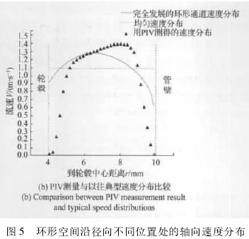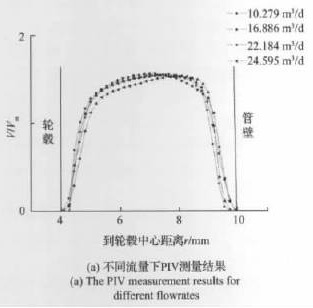 實(shí)驗(yàn)中流量計(jì)的渦輪輪轂半徑為4mm,而管道內(nèi)徑為10mm,因而速度分布都在這6mm的區(qū)間內(nèi)。通過(guò)圖像處理可以獲得32個(gè)不同位置的速度,在此基礎(chǔ)上進(jìn)行插值即可獲得整個(gè)環(huán)空流場(chǎng)的軸向速度分布。圖5(a)反映了實(shí)驗(yàn)所測(cè)得的幾個(gè)不同工況點(diǎn)的軸向速度分布,從圖中可以看出,流速在中間位置較高,由于邊界層的影響,在靠近輪轂和管壁附近流速逐漸趨近于零。隨著流速的升高,整體速度分布向管壁方向偏移,速度*大值位置半徑增大,輪轂表面邊界層厚度增加,管壁表面邊界層厚度減少。與Xu采用LDA測(cè)量的結(jié)果相比,本文結(jié)果在半徑較大處速度較高,二者的不同結(jié)果也反映了不同設(shè)計(jì)的柴油計(jì)量表入口速度分布存在差異。相比LDA而言,PIV可以更加全面地獲得輪轂與管壁之間的流速分布信息。