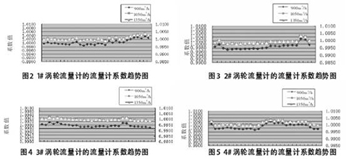 設有1套在線分析系統(tǒng),對原油密度、黏度和含水等**進行檢測。柴油流量表的檢定采用體積管在線檢定,采用體積管對這4臺流量計檢定的流量計系數(shù)(流量計系數(shù)是流量計基本誤差的一種表示方法,貿(mào)易交接量=流量計讀數(shù)×流量計系數(shù))趨勢圖如圖2~圖5所示。