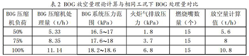 為維持 BOG 系統(tǒng)壓力穩(wěn)定,在正常工況下通過 BOG壓縮機回收 BOG 方式進(jìn)行,在檢修期間采用火炬放空方式進(jìn)行。從表 2 中可以看出,在系統(tǒng)壓力維持一定值時,理論計算值與 BOG 壓縮機處理量基本相同,火炬氣放空量 計算方法可行。