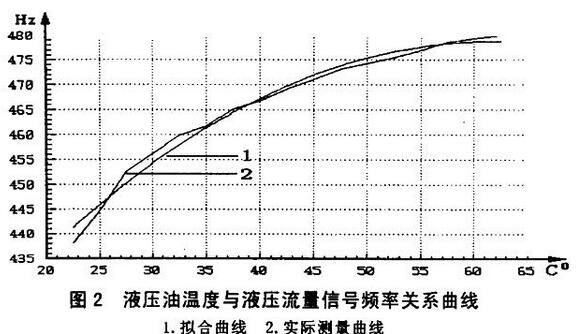 因為以上試驗是在液壓油流量變化的情況下測得, 如果要分析液壓油溫度對流量信號頻率的影響, 就必須將液壓油流量信號頻率修正到某一不變的流量下( 如52 .07L/ m i n 。流量信號頻率修正后, 如表2 所示。根據(jù)表2 對液壓油流量信號頻率的修正, 使用計算機繪制出液壓油溫度與液壓流量信號頻率之間的關(guān)系如圖2 中的曲線2 所示。