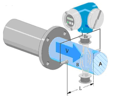 據(jù)法拉*電磁感應(yīng)原理,在與測量管軸線和磁力線相垂直的管壁上安裝了一對檢測電*,當導(dǎo)電液體沿測量管軸線運動時,導(dǎo)電液體切割磁力線產(chǎn)生感應(yīng)電勢,此感應(yīng)電勢由兩個檢測電*檢出,數(shù)值大小與流速成正比例,其值為: