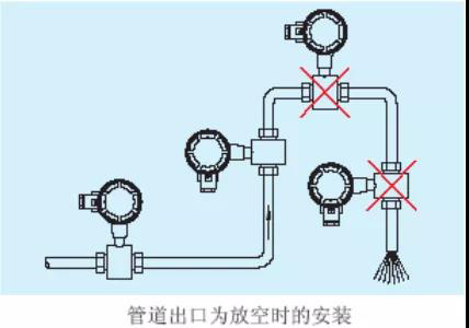 確保流量傳感器在測量時,管道中充滿被測流體,不能出現(xiàn)非滿管狀態(tài)。如管道存在非滿管或是出口有放空狀態(tài),傳感器應(yīng)安裝在一根虹吸管上。