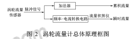 渦輪的旋轉(zhuǎn)角速度是通過裝在機(jī)殼外的傳感線圈來檢測。當(dāng)渦輪葉片切割由殼體內(nèi)永久磁鋼產(chǎn)生的磁力線時,就會引起傳感線圈中的磁通變化。傳感線圈將檢測到的磁通周期變化信號送入前置放大器,對信號進(jìn)行放大、整形,產(chǎn)生與流速成正比的脈沖信號,送入單位換算與流量積算電路得到并顯示累積流量值;同時亦將脈沖信號送入頻率電流轉(zhuǎn)換電路,將脈沖信號轉(zhuǎn)換成模擬電流量,進(jìn)而指示瞬時流量值。圖2為渦輪流量計總體原理框圖。