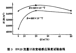 位于流量計之上,緊貼殼體處安裝著磁電轉(zhuǎn)換器,它將對渦輪葉片(由鐵磁性材料制成)產(chǎn)生一個恒定的磁性阻力矩。無論葉片處在靜止或轉(zhuǎn)動過程中都將始終受到這一磁力作用。這一磁力將直接影響著流量計的性能,尤其小流量時影響更大。為了研究該磁力對流量計性能的影響情況,我們選取適當(dāng)?shù)拇鸥袘?yīng)強度,對同一臺DN25流量計進(jìn)行了變磁感應(yīng)強度B的影響試驗,其試驗結(jié)果見表3和圖3。