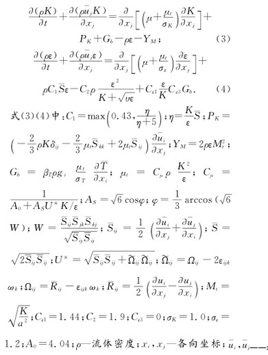 各向流速平均值;a—聲速;μ—動力粘性系數(shù);υ—運(yùn)動粘性系數(shù);K—湍流動能;ε—湍流耗散率;βT—膨脹系數(shù);ωk—角速度;—時(shí)均轉(zhuǎn)動速率張量;如不考慮浮力影響Gb=0,如流動不可壓縮,=0,YM=0。