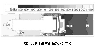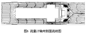 以流量Q=250m3/h的數(shù)值模擬計(jì)算結(jié)果為例進(jìn)行渦輪流量計(jì)內(nèi)部流場及壓力場的分析,圖5為渦輪流量計(jì)軸向剖面靜壓分布圖,前導(dǎo)流器前后的壓力場分布較均勻且壓力梯度較小,在機(jī)芯殼體與葉輪支座連接凸臺處壓力有所增加,連接面后壓力又逐漸減小,故認(rèn)為流體流經(jīng)葉輪支座產(chǎn)生壓力損失的主要原因是連接處存在凸臺,導(dǎo)致流場出現(xiàn)較大變化,不能平滑過渡,建議將葉輪支座與機(jī)芯殼體的連接改為圓弧線型或流線型。觀察圖5和圖6,當(dāng)流體流經(jīng)葉輪從后導(dǎo)流器流出渦輪流量計(jì)時(shí),壓力梯度變化明顯,存在負(fù)壓區(qū)域并造成很大的壓降,在后導(dǎo)流器凸臺及流量計(jì)出口處速度變化明顯,由于氣流通過后導(dǎo)流器后流道突擴(kuò),在后導(dǎo)流器背面形成明顯的低速渦區(qū),產(chǎn)生了漩渦二次流。