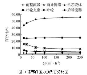 觀察圖10各部件壓力損失百分比圖,可見前整流器、前導(dǎo)流器和機(jī)芯殼體處的壓力損失很小,葉輪支座處壓力損失約占總壓力損失的1/4。前整流器所占壓力損失比例在各流量點(diǎn)基本保持不變,前導(dǎo)流器和機(jī)芯殼體處的壓力損失隨流量的增加其比例略有降低,葉輪支座處壓力損失隨流量的增加其比例略有增加,但總體上受流量影響不大。葉輪處的壓力損失隨流量從13m3/h增加至250m3/h,其比例從15.88%降至8.71%,降幅明顯,后導(dǎo)流器處的壓力損失占總壓力損失的大半,隨著流量從13m3/h增加至250m3/h其壓力損失比例由43.77%升至55.83%,增幅明顯??傊髮?dǎo)流器、葉輪支座和葉輪是流體流經(jīng)渦輪流量計(jì)產(chǎn)生壓力損失的主要影響部件,可通過優(yōu)化其結(jié)構(gòu)以降低渦輪流量計(jì)的總壓力損失。