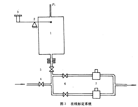 在生產(chǎn)系統(tǒng)或?qū)嶒?yàn)系統(tǒng)上附設(shè)流量標(biāo)定裝置,在不影響生產(chǎn)或?qū)嶒?yàn)工作情況下進(jìn)行標(biāo)定稱為在線標(biāo)定。若每次對流量進(jìn)行檢測時都**進(jìn)行標(biāo)定即為實(shí)時標(biāo)定或稱實(shí)時校準(zhǔn),實(shí)時標(biāo)定可以消除各種參數(shù)的變化對測量精度的影響。圖3為質(zhì)量法在線標(biāo)定系統(tǒng),它附設(shè)在工作系統(tǒng)中,可以進(jìn)行實(shí)時標(biāo)定。處于工作情況時,打開開關(guān)4、5、6,,油液通過渦輪流量計(jì)7去工作系統(tǒng),同時通過開關(guān)5充往計(jì)量油箱1,計(jì)量油箱與液體管道無剛性連接,全部質(zhì)量通過杠桿2作用在力傳感器3上,計(jì)量油箱充一定的油液后在傳感器輸出信號控制下關(guān)閉開關(guān)5,作好標(biāo)定準(zhǔn)備。標(biāo)定時,打開開關(guān)5,關(guān)閉開關(guān)4,此時計(jì)量油箱中的油液在計(jì)量油箱上方提供的一定氣壓P1驅(qū)動下經(jīng)過被標(biāo)定流量計(jì)進(jìn)人工作系統(tǒng)。此時只需測出力傳感器測出的起始質(zhì)量M1到終了質(zhì)量M2之間的時間就可得到質(zhì)量流量,達(dá)到終了質(zhì)量M2后,自動打開開關(guān)4,恢復(fù)正常工作狀態(tài),該系統(tǒng)在計(jì)算機(jī)控制下很容易實(shí)現(xiàn),并立即求出實(shí)時的儀表常數(shù),計(jì)算機(jī)每次采集流量數(shù)據(jù)之前按上述過程進(jìn)行一次實(shí)時標(biāo)定。然后進(jìn)行數(shù)據(jù)采集,按實(shí)時標(biāo)定的儀表常數(shù)進(jìn)行數(shù)據(jù)處理。
