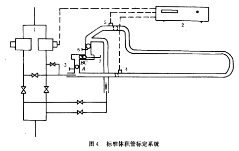 由于標(biāo)定系統(tǒng)難免有殘存液體,尤其是粘性較大時附著在壁面上的液體,須另加沖洗系統(tǒng)和加熱系統(tǒng),使設(shè)備復(fù)雜化。另外,容積法受容積誤差影響,質(zhì)量法受管路系統(tǒng)支撐系統(tǒng)影響,測量精度受到限制,近代出現(xiàn)的標(biāo)準(zhǔn)體積管具有精度高、系統(tǒng)簡單、占地面積小、便于在線標(biāo)定、容易配合計(jì)算機(jī)進(jìn)行實(shí)時標(biāo)定,尤其適于粘性液體,被公認(rèn)為*佳的粘性液體流量標(biāo)定裝置。其基本原理是檢測通過一定容積液體所需時間,標(biāo)準(zhǔn)體積管的容積誤差為±0.35%。圖4為標(biāo)準(zhǔn)體積管標(biāo)定系統(tǒng)原理圖,工作順序?yàn)椋喊纬鲣N3,球A落入管道,再插進(jìn)銷3,球A被流動的液體推動到檢測器4時,檢測器給計(jì)時器發(fā)信號,開始計(jì)時,球A到達(dá)檢測器5時,給計(jì)時器發(fā)出停止計(jì)時信號,計(jì)量結(jié)束。2檢測器之間的體積一定,按所計(jì)時間求出容積流量。球A繼續(xù)前進(jìn),停在銷6處。推球器7退出,拔出銷,6,球A生落下,同B、C球并列,推進(jìn)推球器7,使B球落下,用C、A2球密封,B球落在銷3上,同時插進(jìn)銷6,等待下一次標(biāo)定。